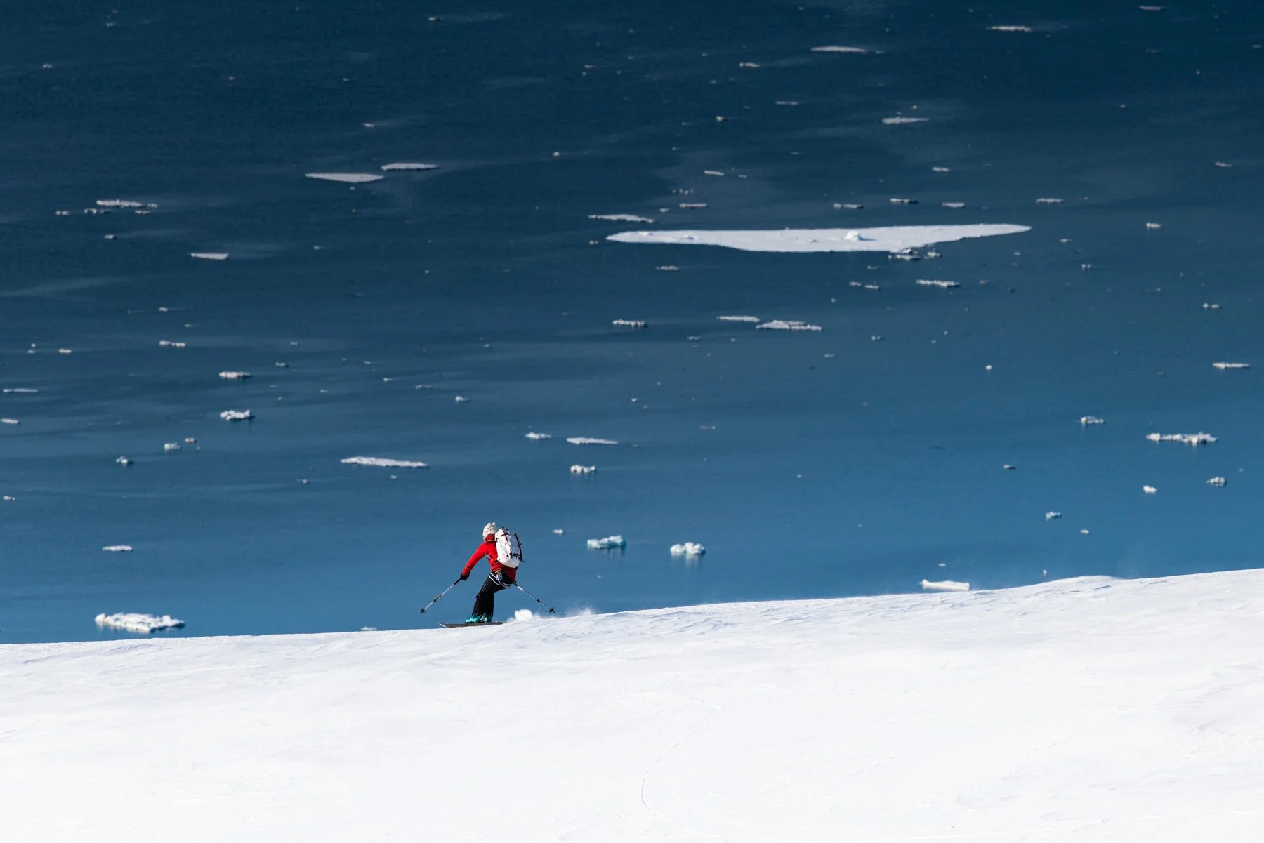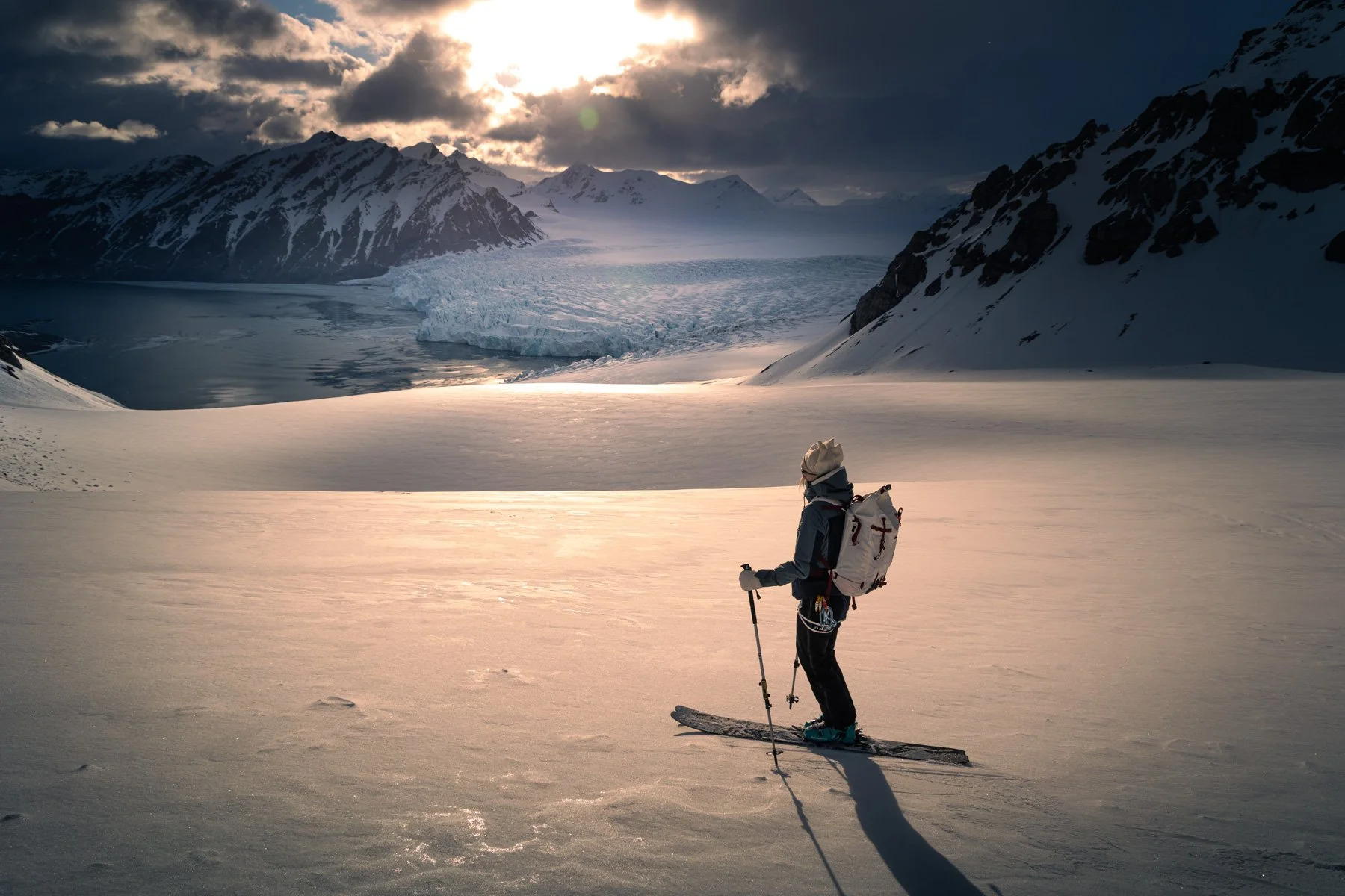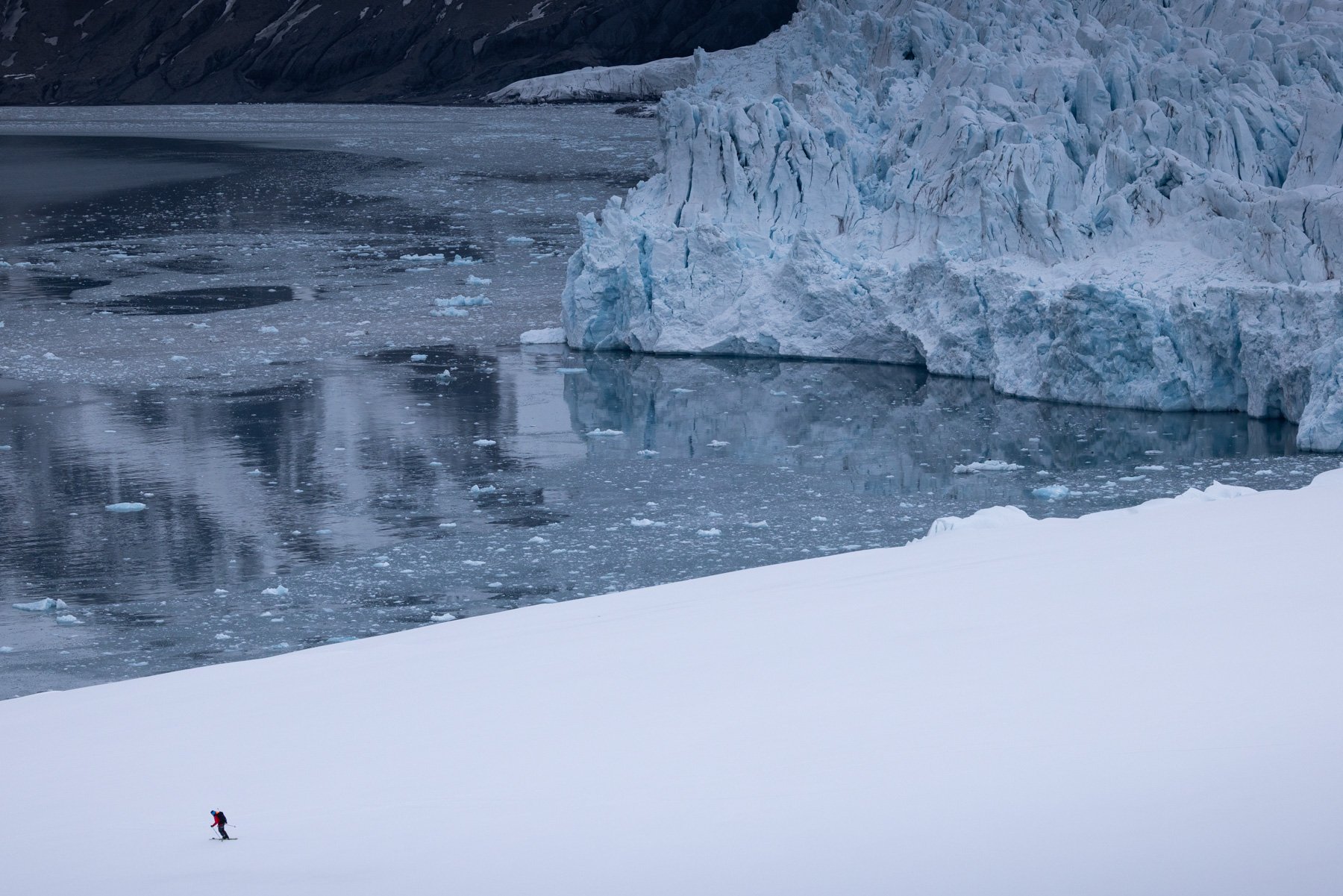Ski touring in Svalbard takes place in one of the most remote and visually striking environments on Earth. Dramatic glaciers, steep couloirs rising directly from the Arctic Ocean, provide a natural stage for powerful storytelling.